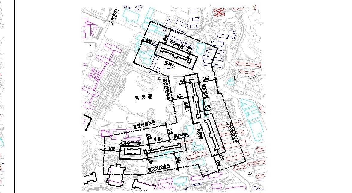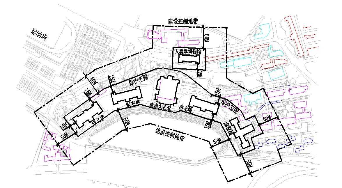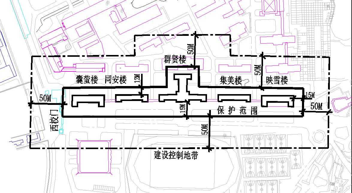 建设控制地带:各楼群保护范围往四周外延50米,相邻建筑纳入建设控制范围。