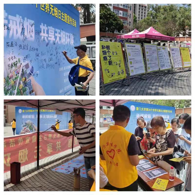 为进一步提高我校师生对烟草危害的认识,引导师生远离烟草、养成健康文明的生活方式,6月3日上午,由学校禁烟工作领导小组主办,资产与后勤事务管理处、公共卫生学院共同承办的以“承诺戒烟,共享无烟环境”为主题的第34个世界无烟日宣传活动在思明校区三家村广场举办。