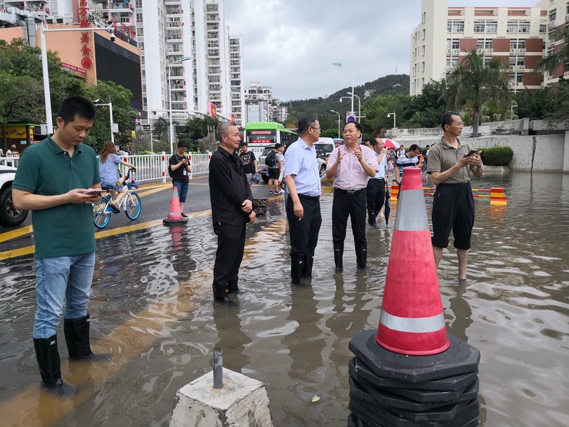 西校门积水、芙蓉湖溢水、高压水泵房进水、囊萤楼进水……5月7日10时至13时,短短3个小时,厦门市遭遇了特大暴雨的袭击,厦门大学区域雨量达210.5毫米!面对突如其来的灾情,学校迅速启动防御暴雨洪水Ⅰ级应急响应,校长张荣,校党委副书记、纪委书记赖虹凯,副校长叶世满,校党委常委、校长助理邱伟杰等在第一时间赶到现场指挥排涝工作,有序安排部署,在校区全面开启排涝救灾模式。