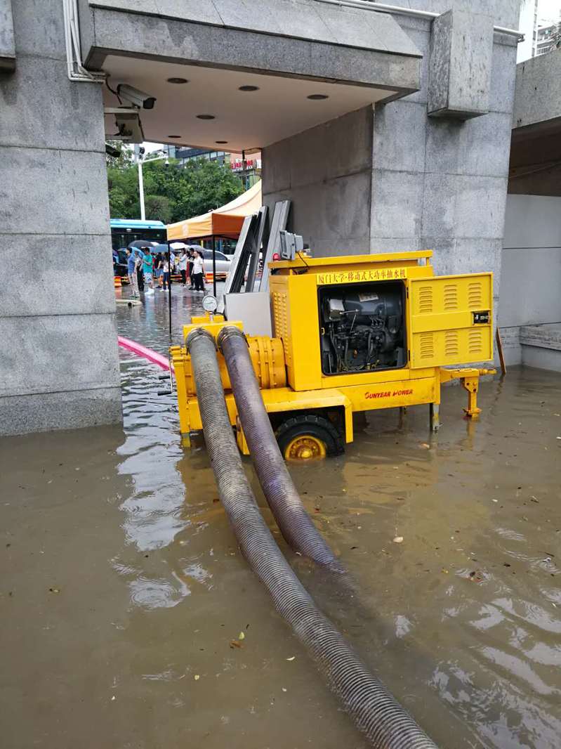 汛情就是警报,肆虐的暴雨和上涨的水位触发了学校排涝应急机制,所有岗位各司其职、严阵以待。厦门大学西校门地势低洼,是周边区域的汇水区,暴雨期间最深水位达1米。12时,排涝泵站水位达到设定警戒位,学校主次泵站迅速启动了排洪模式;13时,水位迅速上涨,为了防止校外演武路积水倒灌校内,职能部门领导冒着暴雨蹚着积水现场指挥,水电工作人员在积水中用人力接龙成一条运输线为西校门安装挡水板。为了加快排水速度,尽快恢复校园正常秩序,资产处紧急调用两台移动式大功率抽水泵进行抽水排涝,厦门市园林局增援四台抽水泵为厦大排洪出力。