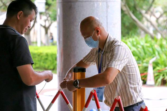 ▲林洁(右一)在核酸检测现场参与布置