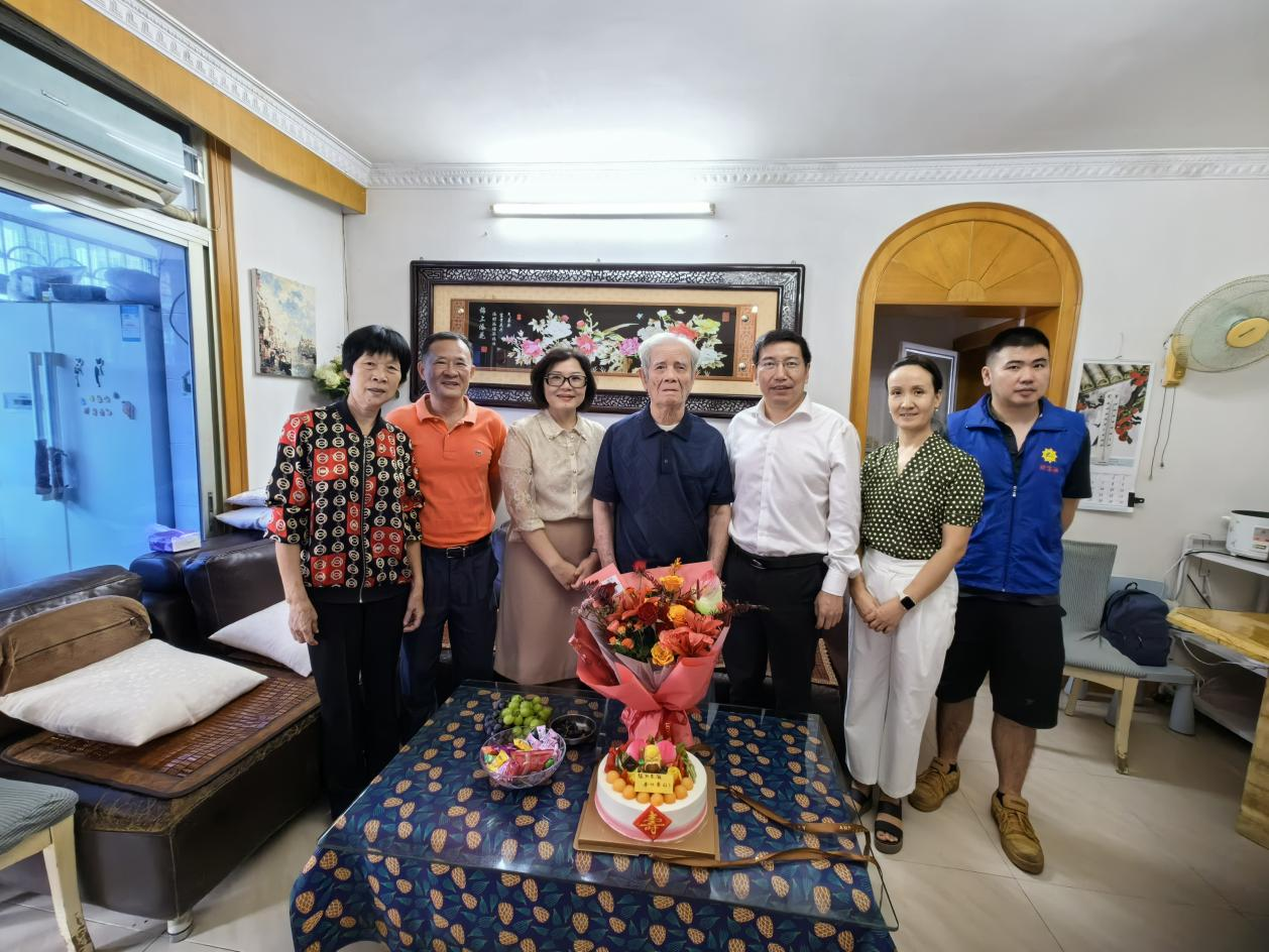 “老人家的身体怎么样?”“生活上还有什么困难?”走进郑谋家中,陈雪玲、王沈扬、贺文英一行与老人及其家属闲话家常,关切地询问老人的生活起居、健康状况以及家庭成员等情况。即将百岁的郑谋老人思路清晰、身体硬朗,目前与儿女共同生活,孝老敬亲、家庭和睦的良好家风感染了社区邻里。大家为老人的精气神点赞,祝他健康长寿、幸福快乐,并叮嘱老人的子女弘扬好家风,尽心尽力照顾好老人的生活起居,让老人生活更加安心、顺心、舒心。郑谋老人在谈话中也表达了对学校的感激:“你们的服务真好呀!不仅逢年过节来看望,而且对我们老年人非常关心,即便退休几十年也时常能感受到来自学校大家庭的温暖。”质朴的话语透着对党和学校的深深感激。