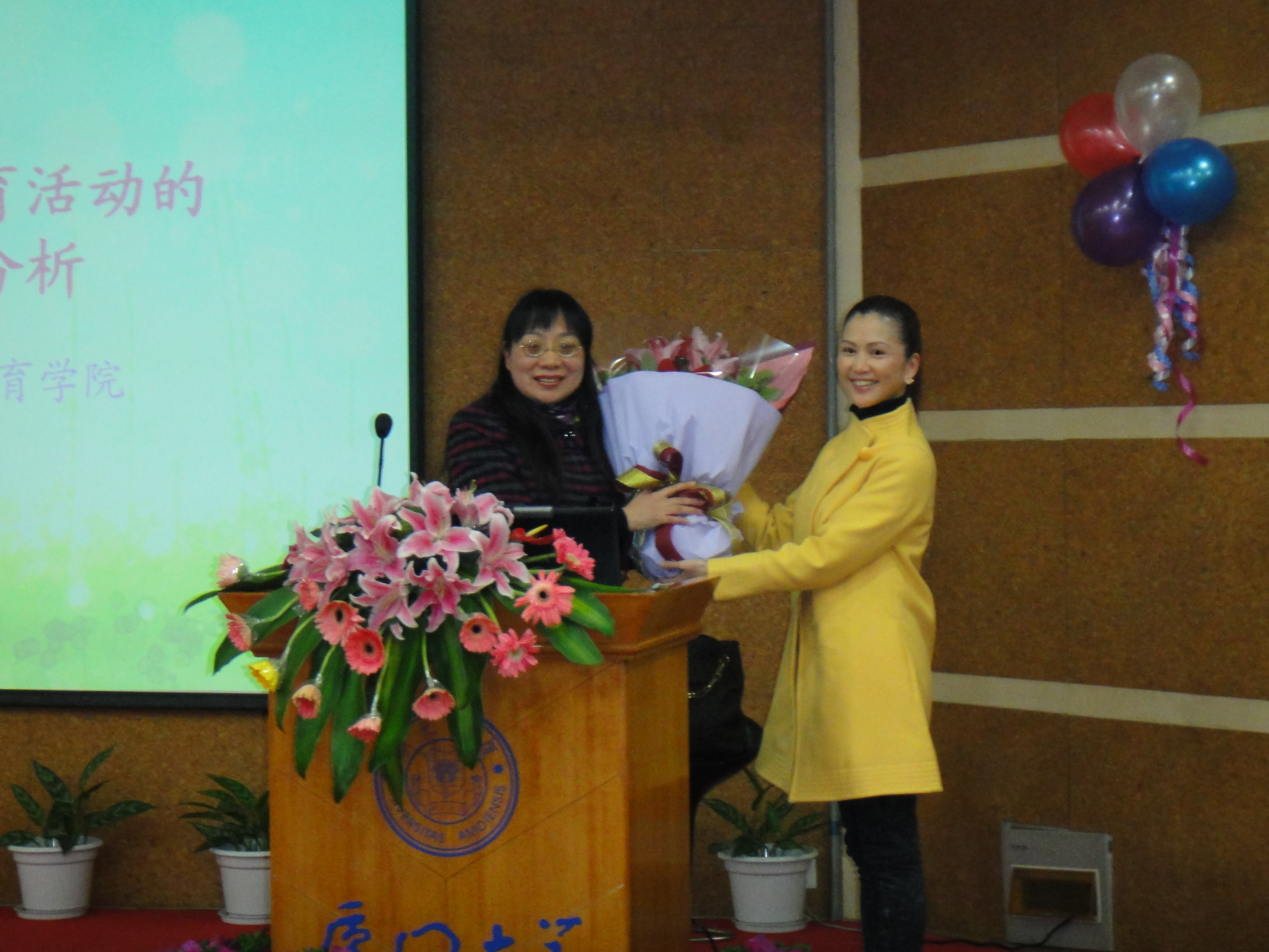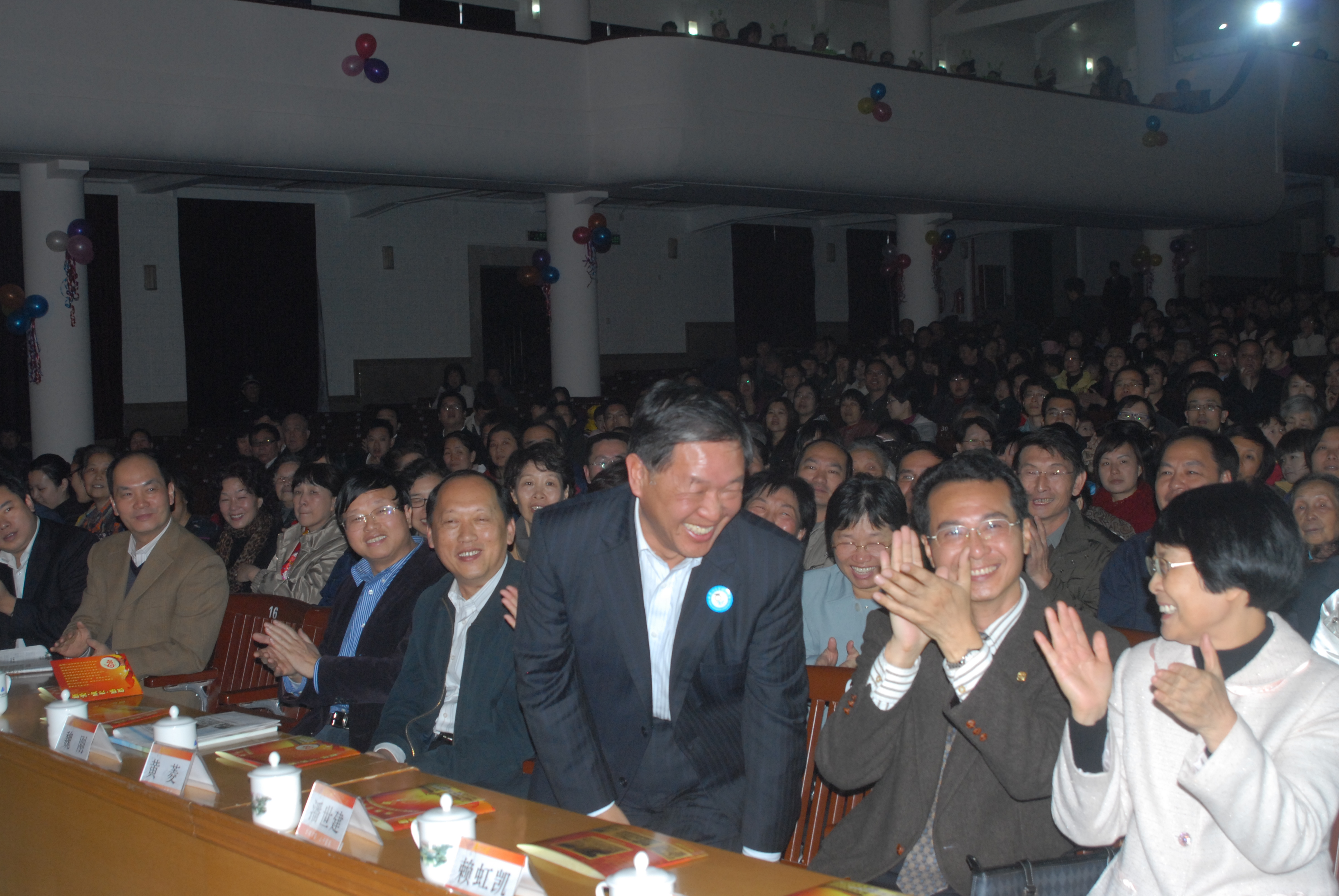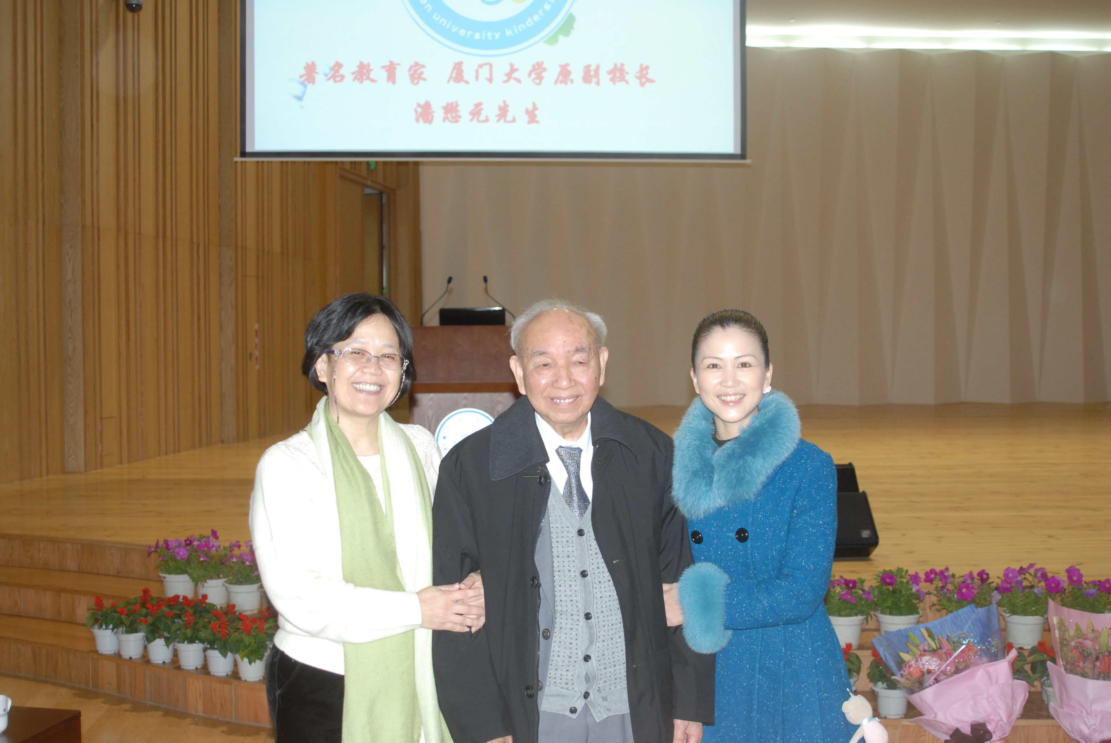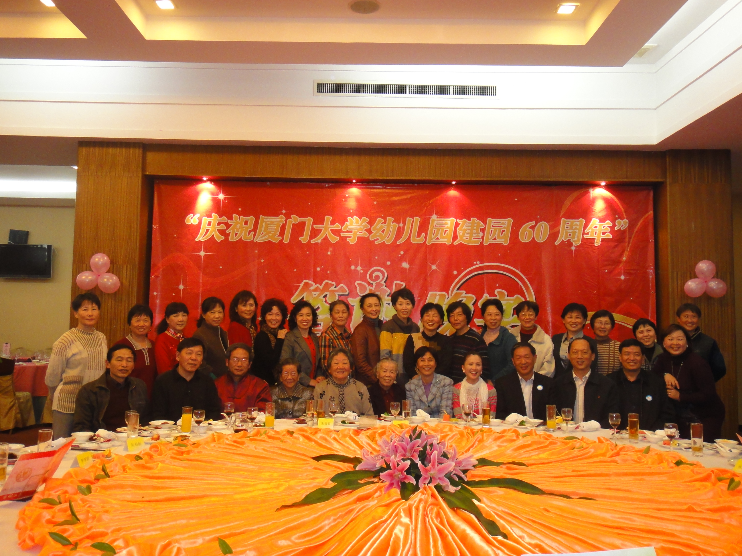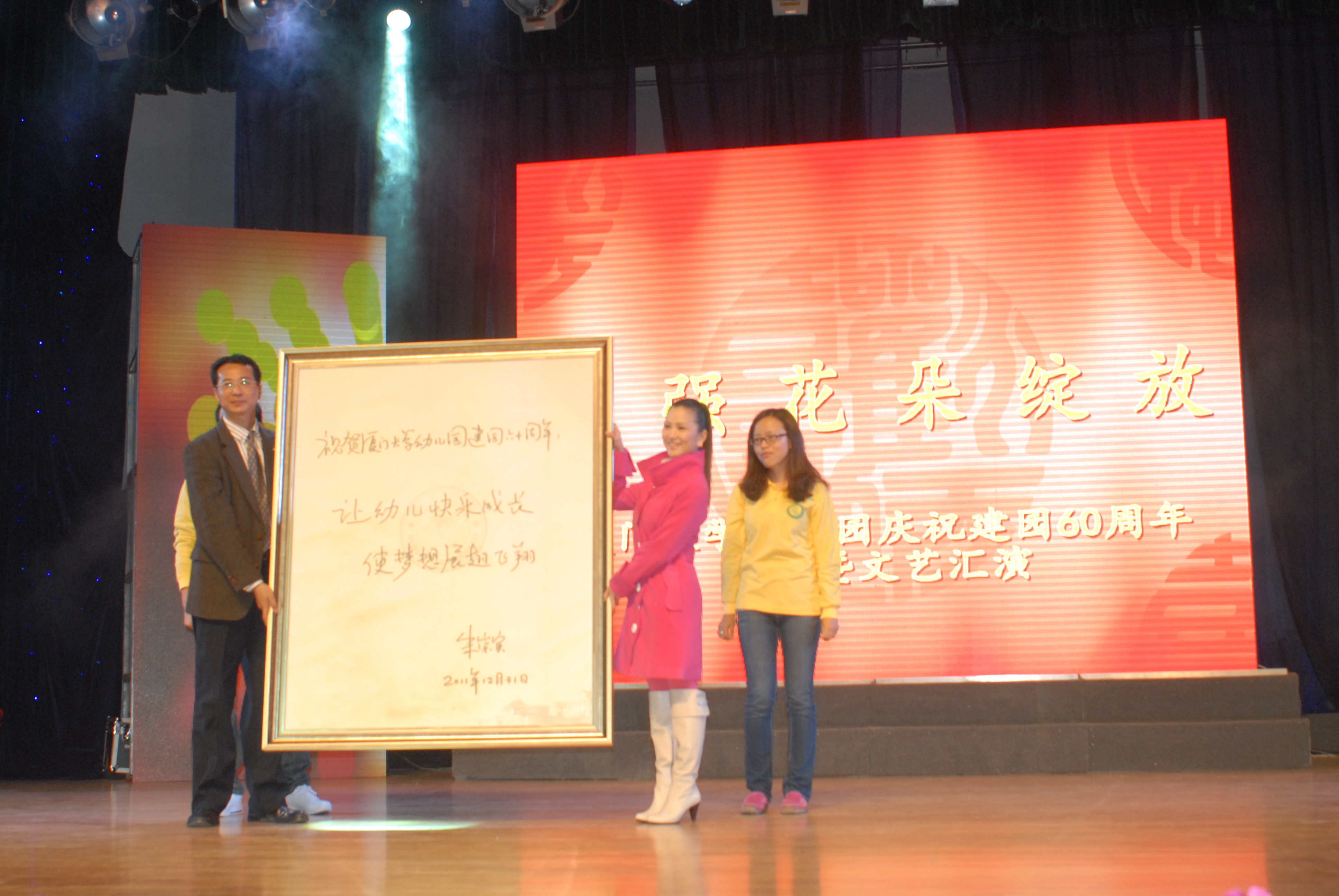 2012年元月8日下午,“厦门大学幼儿园建园60周年”庆典暨文艺汇演隆重举行,历史厚重的厦门大学建南大礼堂高朋满座,教育部正司级巡视员、基础教育司原副司长朱慕菊,教育部基础教材处处长李水平,中国教育报学前教育周刊主编苏令;福建省人大常委会副主任洪华生,福建省政协副主席、中国科学院院士、园友郑兰荪,福建省政协副主席、国家会计学院院长、园友邓力平,福建省教育厅基教处副处长吴舢舢,福建省经贸委党组副书记、园友钟安平;厦门市领导、园友黄菱、潘世建、魏刚,厦门大学原副校长、园友潘世墨;厦门市宣传部副部长林朝晖,厦门市教育局副局长郭献文,思明区副区长程欣,思明区教育局局长林燕莉、副局长游怀忠;厦门大学党委副书记陈力文,副校长赖虹凯,校长助理韩景义,厦门大学各院系党政领导;著名教育家潘懋元,来自台湾的杨茂秀、陈筠安等幼教专家以及厦门日报、厦门电视台、厦漳泉三地幼教姐妹园同行、厦大幼儿园其他各届园友、老教师、老领导等欢聚一堂,笑语满屋。