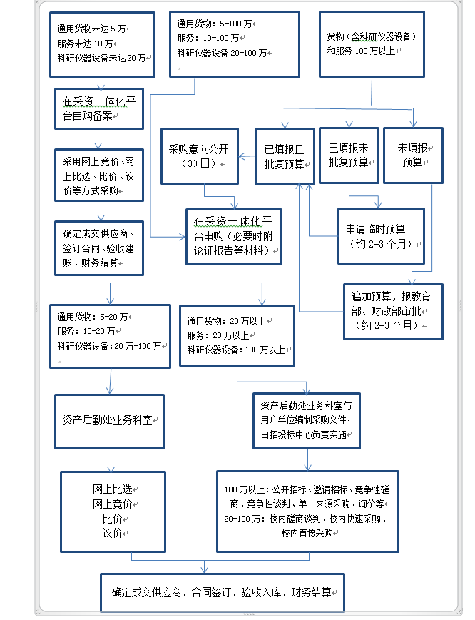 招投标中心:20万元以上的通用货物,纸本资源等图书资料;20万元以上的服务、修缮工程;50万元以上的镜像或者具有永久访问权的数字资源等图书资料;100万元以上的科研仪器设备。