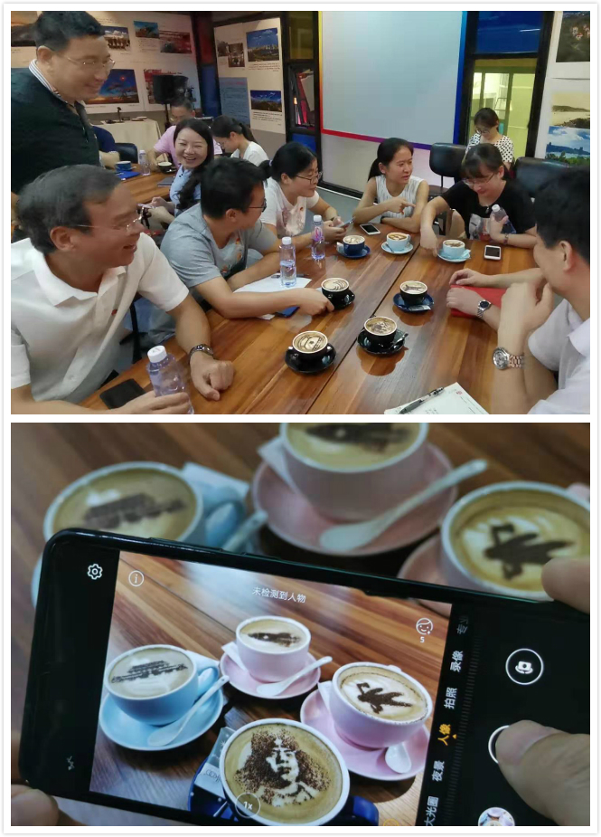 “我们组的咖啡可以用一句诗来概括,就是‘为有牺牲多壮志,敢教日月换新天’。图案摇篮代表‘革命领导人及武装力量的变化’,丰碑林代表‘革命局势的变化’,天安门代表‘人民政权的变化’,兵灾村代表‘精神面貌的变化’,樵夫代表‘乡村面貌的变化’,火箭代表‘科学技术的变化’。”事务管理科的胡敏用六个“变化”概括了咖啡图形背后的精神,“正是因为有党员的牺牲奉献和坚定信念,才换来了我们今天的‘日月新天’、幸福生活!”